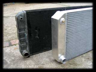Here are some images showing the comparison between the standard OEM radiator and the new fabricated one. The intension was to use the biggest core possible and to take advantage of the fact that there is no AC. Given the size difference of the cores, I would estimate that it is practically double the capacity - that should represent the end of any potential cooling issues.