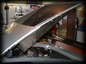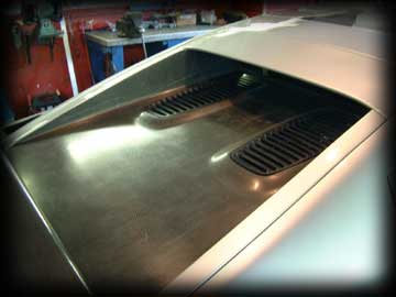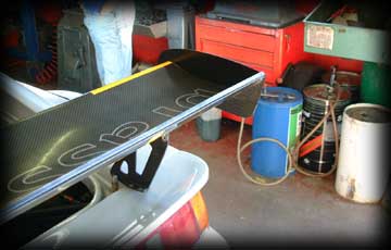 After deciding to replace both the rear deck and doors with carbon fibre versions, these items were prepared from the original moulds. MHR have moulds for all Esprit GT1 body-panels. It was agreed that the original oval vents from the Sport350 would be fitted into the carbon deck. On the race car, the engine cover is physically lifted off to gain access to the engine compartment. For my application, it became necessary to design a special tilting mechanism for the rear wing. This allowed for the necessary clearance for the rear deck to operate on a single hydraulic strut. The rear wing is mounted directly onto the rear body to allow the down-force to act directly to the rear bodywork and not through the engine cover.