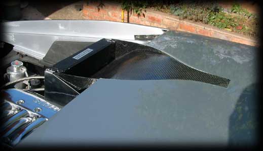 The roof panel has been replaced with a carbon version and houses the roof NACA duct for the transmission oil cooler. The duct offers a low-pressure path for air travelling over the top of the car and directs it through a 12 row Mocal oil cooler.