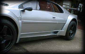 On the race car the flat floor extends to the sides and mates with the doorsill. In conjunction with the wheel arch extension, second lower sill extensions were added. This second lower sill was added initially for aesthetic reasons, as it keeps the profile of the central part of the car at the same depth as the front splitter. But will also reduce the amount of air under the car.